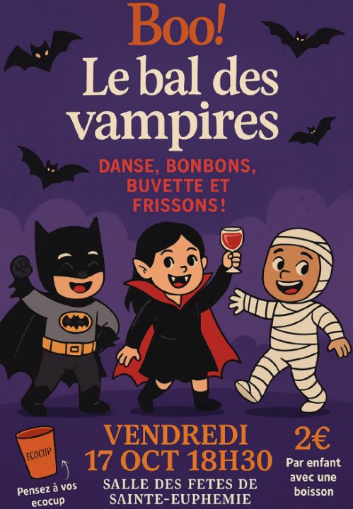 Le vendredi 17 octobre à 18h30, petits monstres, vampires et sorcières sont attendus nombreux pour Le Bal des Vampires organisé par le Sou des Écoles !